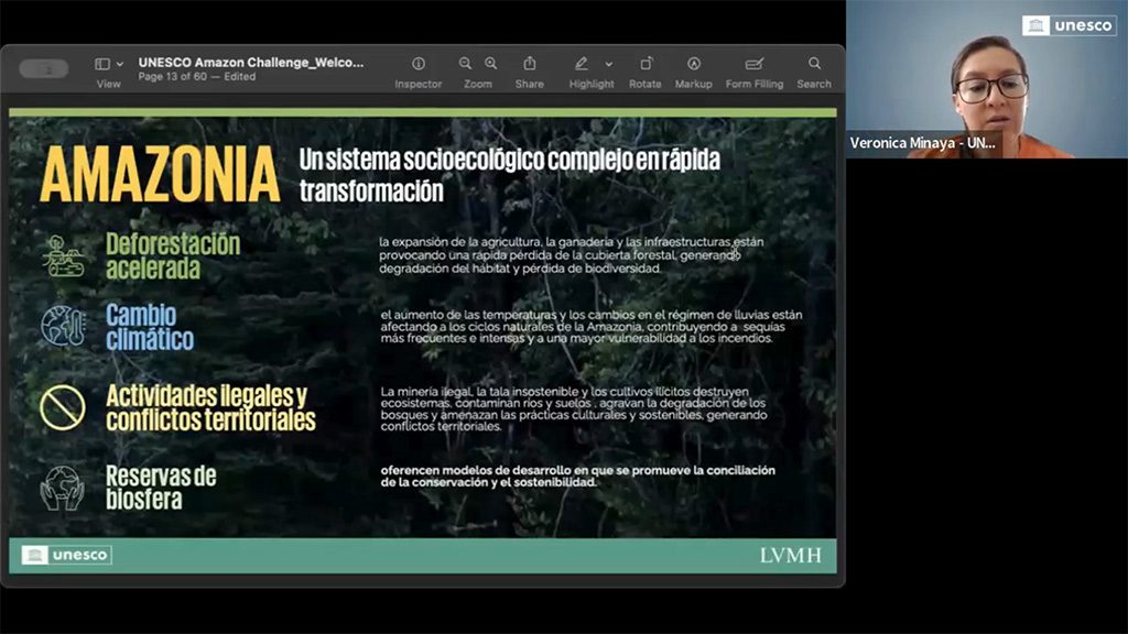 The session continued with a detailed program overview of the UNESCO Amazon Water Resilient Challenge: Ecuador 2025, by Mr. Gregor from The Water Agency, highlighting the three key phases: Biosphere Academy I (Learning), Biosphere Academy II (Solution Development), Biosphere Academy III (Implementation), and the final Showcase event. Participants also explored the critical water challenges facing the Podocarpus-El CĂłndor Biosphere Reserve, including deforestation, mining pollution, and climate-related water stress. Specific case studies were then introduced – such as Loja Water Smart, Farming for Water, and Water for All – which teams will tackle during their fieldwork and solution development.